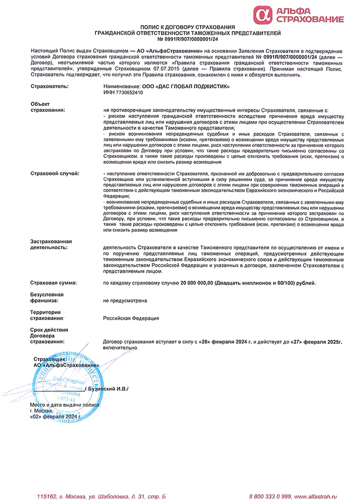 - Страховой полис (АО «АльфаСтрахование») № 0991R/907/0000001/24 от 28 Февраля 2024 г. – страхование гражданской ответственности при осуществлении деятельности таможенных представителей.